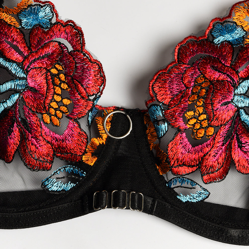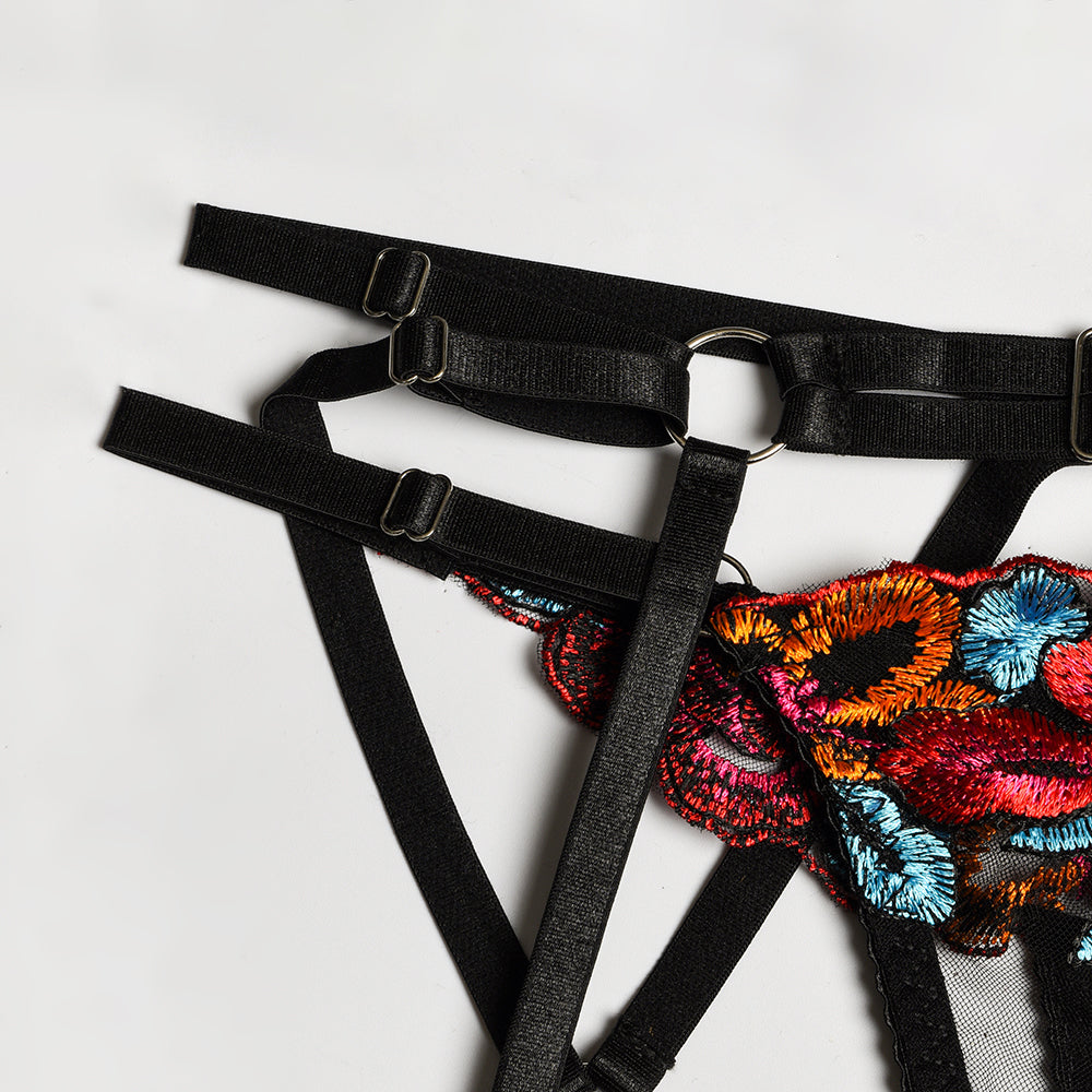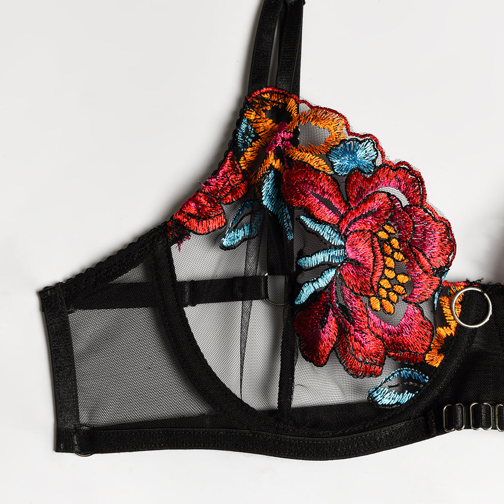 Bra Set - 3 Pcs Sexy Embroidery Transparent Lingerie with Garters